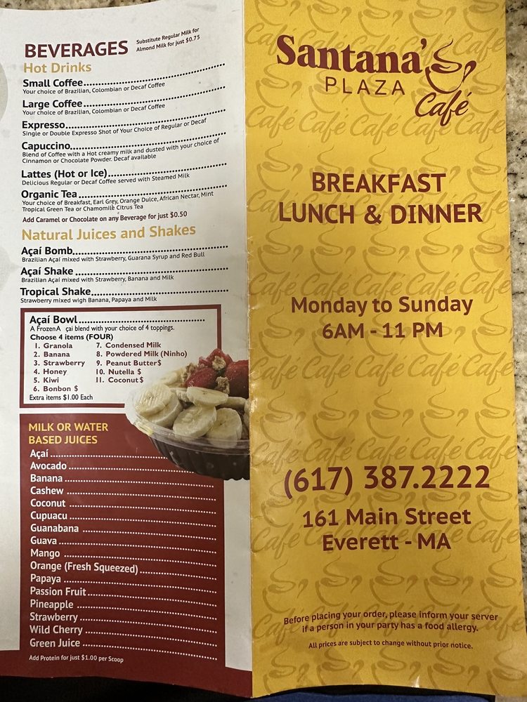Welcome to Santana's Plaza Café, a hidden gem in Everett, MA, celebrating the vibrant flavors of Brazil. Known for its welcoming ambiance and an extensive menu, this café has quickly become a favorite among locals and visitors alike. From the delightful pão de queijo to the hearty frango a parmegiana, every dish is crafted with authenticity and care.